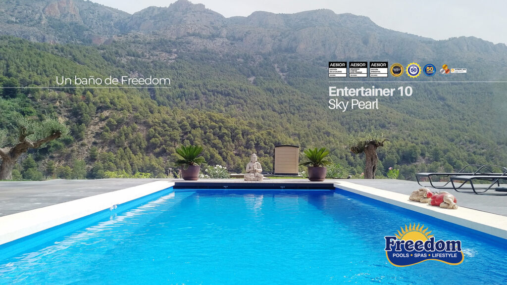 Gamme avec un banc continu sur toute la longueur de la piscine, offrant un espace de divertissement et de détente.